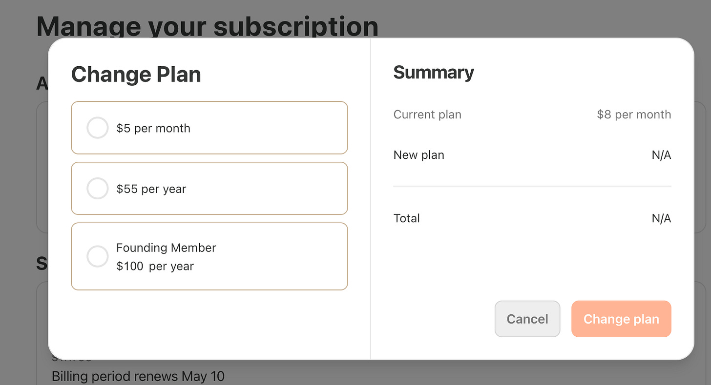 Frances here, Peter’s editor. A month ago we decided to thank you for your generous patronage by lowering the monthly subscription rate. We assumed the price change implemented on our end would automatically apply to you but it doesn’t. You have to change your subscription rate manually.